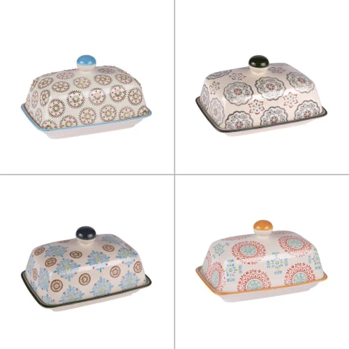 Votre beurre va enfin trouvé sa place ! ce charmant beurrier s’accordera à la perfection avec les autres éléments de la collection bohème : tasses, théière, mugs et bien d’autres !la collection bohème, avec ses associations de couleurs rayonnantes, est entièrement peinte à la main et faite de grès artisanal. ses motifs qui entremêlent couleurs et arabesques suggèrent une composition florale graphique et raffinée. sa finition brillante et les légers reliefs créés par les rappels de couleurs en font une vaisselle de caractère, qui apportera lumière et bonne humeur dans votre foyer. (1 modèle aléatoire parmi les 4 décors assortis. Si vous avez une préférence pour un décor, veuillez nous envoyer un message après votre commande, nous ferons de notre mieux afin de vous satisfaire.Collection : Bohème Matière : Grès Couleur : Multicolore Longueur : 16.5 cm Largeur : 11 cm Hauteur : 9.5 cm Compatible Lave-vaisselle Compatible Micro-onde