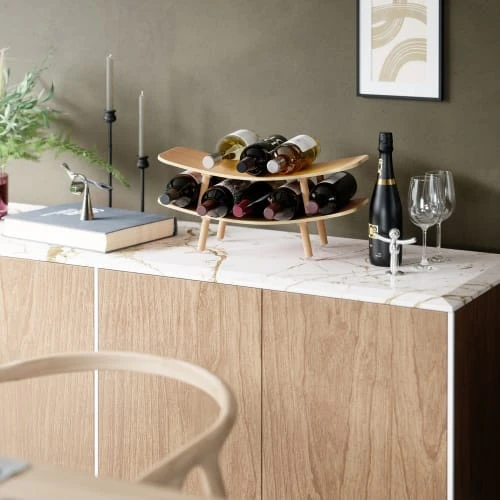 PrĂ©sentez et stockez vos bouteilles avec style grĂące Ă Vinola. Sa forme arquĂ©e et lisse permet d’exposer facilement vos bouteilles de vin tout en ajoutant une touche dĂ©corative Ă votre cuisine, salle Ă manger ou chariot de bar. Empilez jusqu’Ă trois niveaux pour un rangement maximal, chaque niveau pouvant contenir jusqu’Ă cinq bouteilles de vin. Vinola peu Ă©galement ĂȘtre utilisĂ© comme rangement polyvalent. MatiĂšre : contre-plaquĂ© Dimensions : 54 x 28 x 30