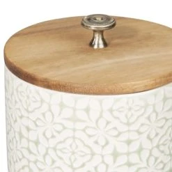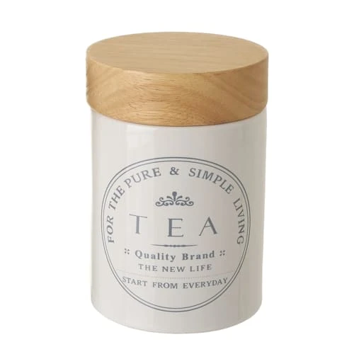 Bocal à thé rétro en céramique Couvercle en bois de chêne Le bocal passe au lave vaisselle mais pas le couvercle Dimensions : Hauteur 15.5 cm – Diamètre 10 cm