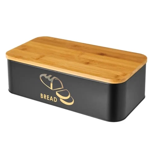 Boîte à pain en métal noir et couvercle en bambou.Couleur: Noir et bambouMatière: Métal et bambouDimensions: 42.5x23x17.5cm