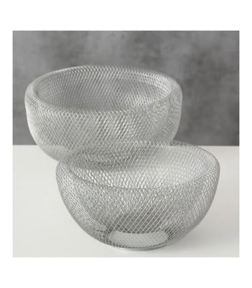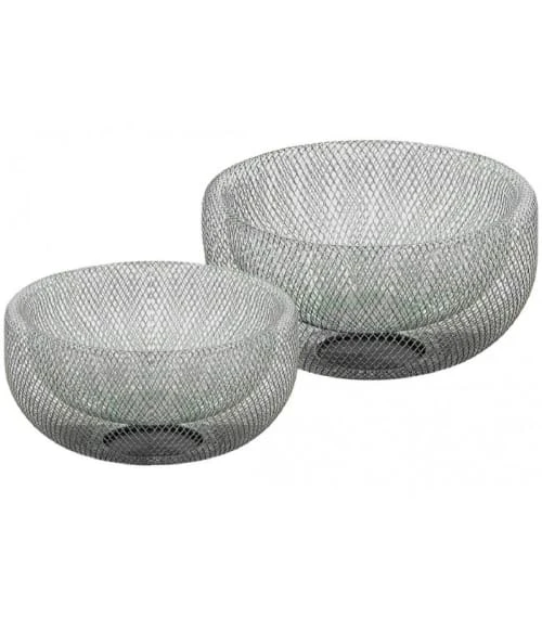 Set de 2 corbeilles à fruits en métal argenté. Ces corbeilles peuvent également servir de vide poches ou simplement de corbeilles décoratives à poser dans une entrée ou dans un salon. Ces deux corbeilles design se caractérisent par leur élégance. Grâce au design très épuré, ces corbeilles encastrables sont de véritables objets décoratifs pour votre intérieur. Dimensions Grande Corbeille: Diam. 28,5cm x Haut. 14,5cm – Dimensions Petite Corbeille: Diam. 24cm x Haut. 11,5cm – Matière: Métal – Couleur: Argent