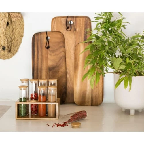 Support à épices pour cuisine en bambou et ses 8 pots à épices ronds en verre avec couvercle en bambou.