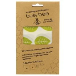 Emballage alimentaire écologique. Cet emballage, véritable alternative au papier aluminium et ua film plastique, permet d’enrober vos aliments (pain, bocaux, tupperware), de façon quasi hermétique. Réutilisable de 120 à 150 fois, la feuille Busy bee est facile à utiliser. Les propriétés antibactériennes de la cire d’abeille sont idéales pour conserver vos aliments. Ne convient pas au lave-vaisselle ou au micro-ondes. Ne pas exposer à des températures supérieures à 60°C. Laver à la main avant la 1e utilisation, à l’eau froide, avec un détergent au PH neutre, type savon. Suspendre pour sécher.